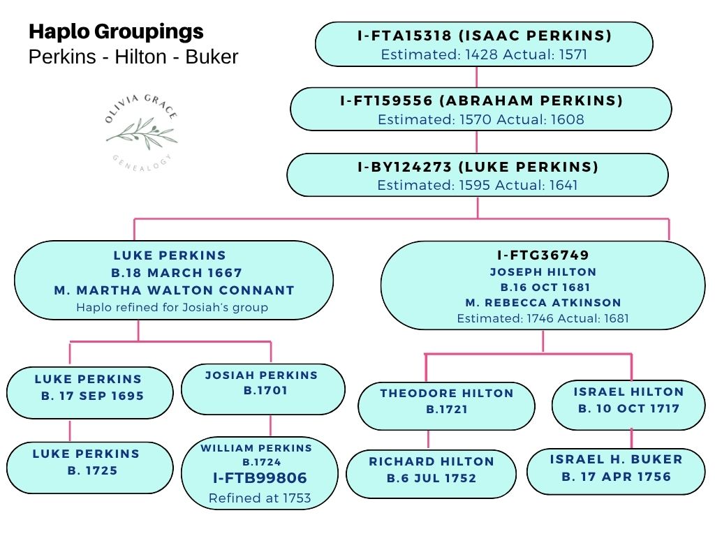 Haplogroup refined: Vince Buker’s test was further refined by the test# 168801 a descendant of Joseph Hilton placing them in the same grouping underneath the Perkins grouping in the Family Tree DNA block tree.