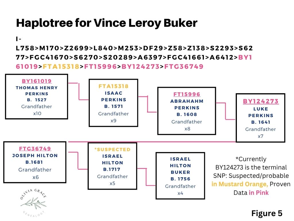 Future Study Theory: Although the study is in infancy and not developed we also believe that another NPE (non-paternal event) occurred as shown in the Haplotree for Vince Leroy Buker and in the BHP Lineage Page. Lineage appears to be Israel Hilton Buker - Israel Hilton - Joseph Hilton - Luke Perkins. The historical documented lineage for Joseph Hilton was considered to be father, Edward Hilton. We believe Edward raised Joseph but that the biological father was Luke Perkins due to our placement within the Perkins YDNA Haplogroup. This 2nd NPE event will be explored at a later date and will need to rely on YDNA evidence. More testers are needed.